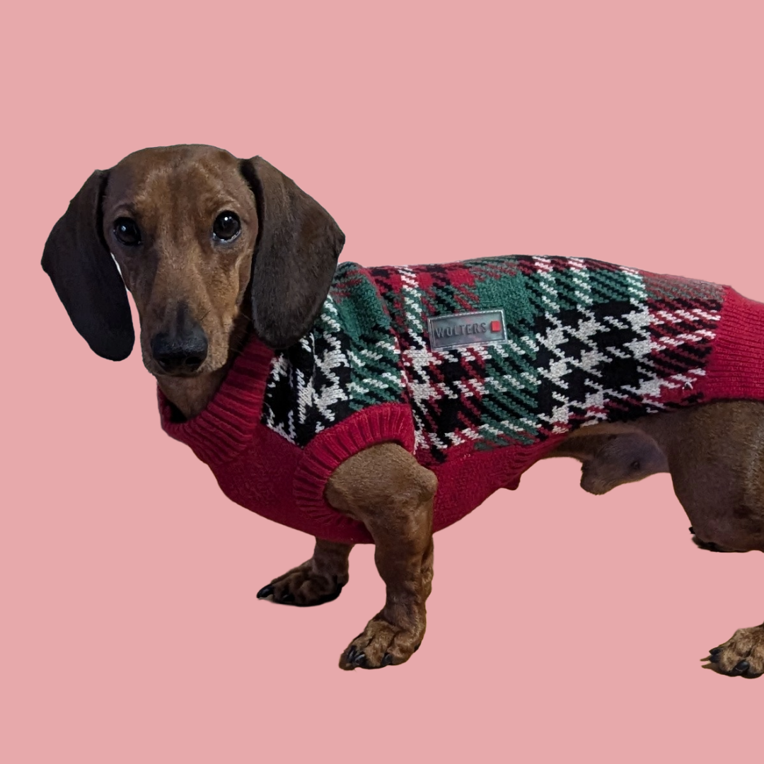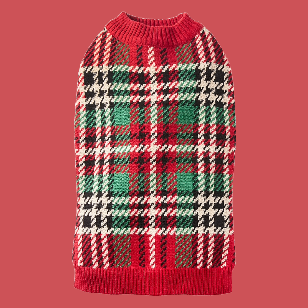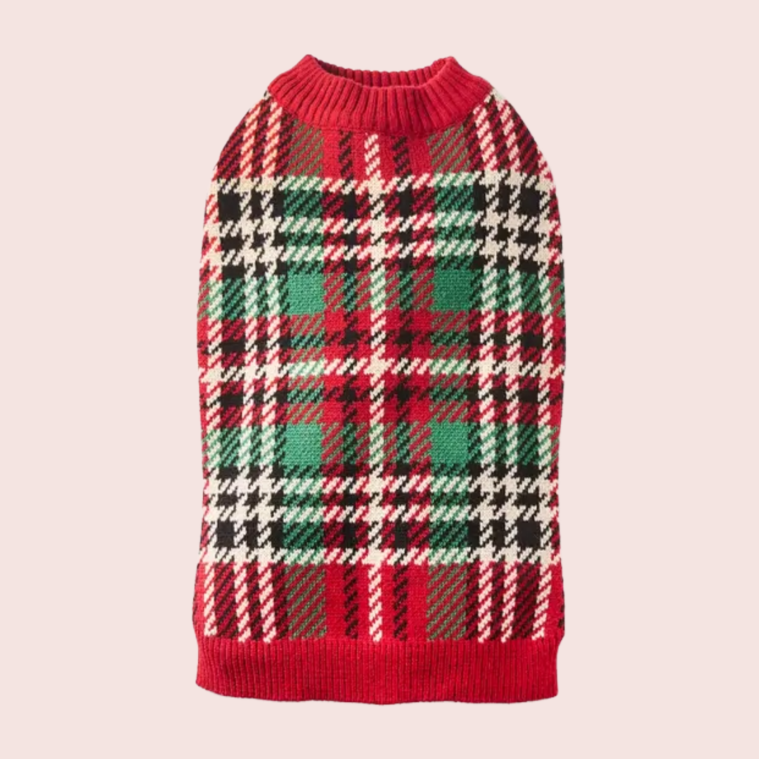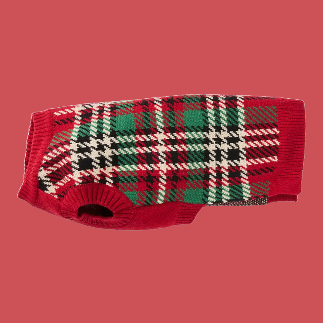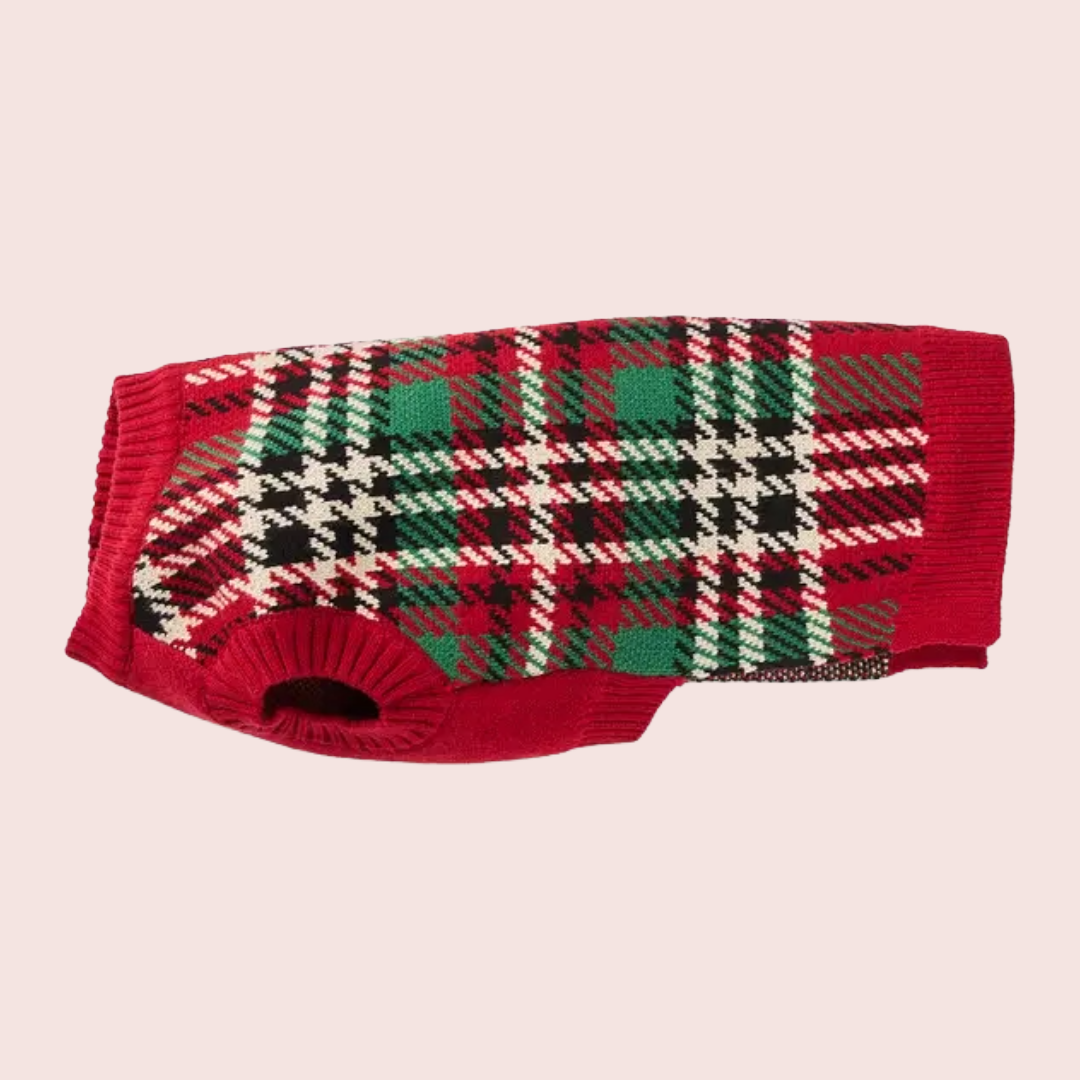 Het rood-groene ruitjespatroon maakt van de gebreide trui een modieuze blikvanger, perfect voor de winter en de kersttijd.