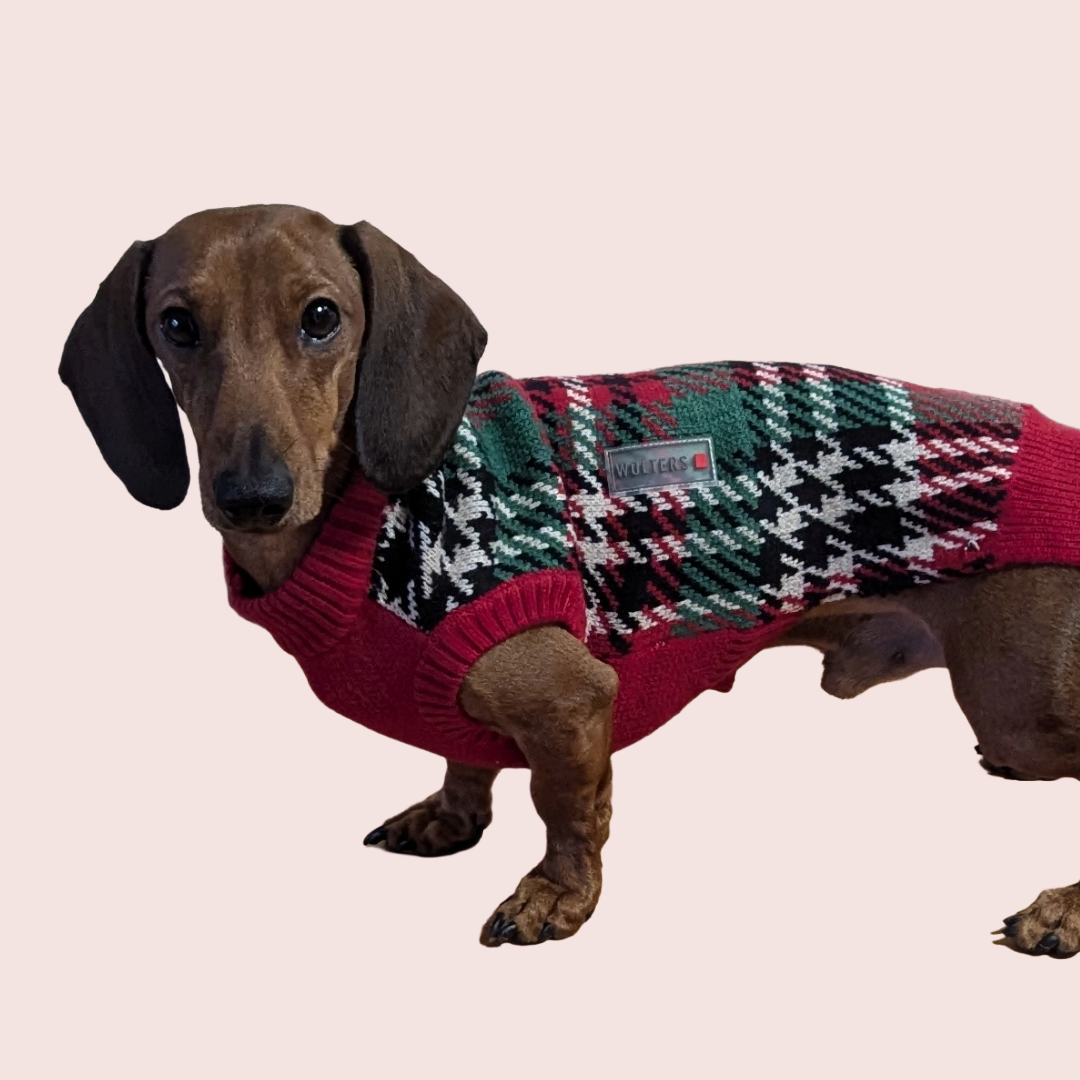 De gebreide trui Caroline van WOLTERS beschermt kleine tot middelgrote honden tijdens de overgangsperiode tegen de kou en ziet er tegelijkertijd stijlvol uit.